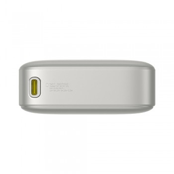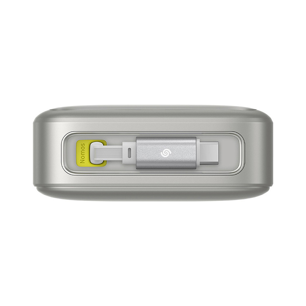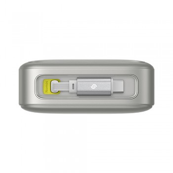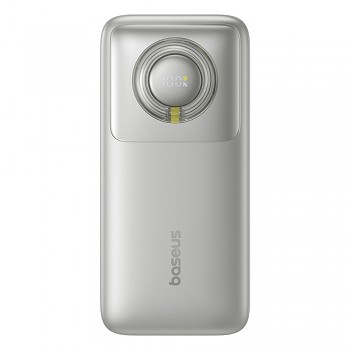 Tato power banka v sofistikované šedé barvě se pyšní minimalistickým a zároveň vysoce funkčním designem. Její kompaktní obdélníkové tělo s jemně zaoblenými hranami skvěle padne do ruky i do každé tašky. Dominantou je integrovaný, zatahovací USB-C kabel, který je elegantně uložen přímo v těle power banky, což eliminuje potřebu nosit další kabely a předchází jejich zamotání. Kabel je zakončen konektorem s výrazným žlutým akcentem, který dodává designu moderní šmrnc. Na přední straně naleznete přehledný kruhový digitální displej, který v reálném čase zobrazuje zbývající procenta baterie, takže máte vždy dokonalý přehled o stavu nabití. Logo Baseus a označení 65W jsou decentně umístěny na povrchu, podtrhující prémiový vzhled zařízení. Na boku je pak umístěn další USB-C port, který slouží pro vstup i výstup.