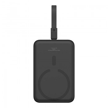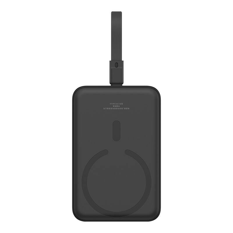 Tato power banka v černém provedení se pyšní minimalistickým a sofistikovaným designem. Její kompaktní rozměry a nízká hmotnost z ní činí ideálního společníka na cesty. Na jedné straně dominuje magnetický kruh MagSafe, který umožňuje snadné a pevné přichycení k zadní straně kompatibilního telefonu pro bezdrátové nabíjení. Integrovaný USB-C kabel slouží nejen k nabíjení, ale zároveň funguje jako praktické poutko pro snadné přenášení. Na boku naleznete tlačítko pro zapnutí a LED indikátory, které přehledně zobrazují aktuální stav baterie. Celkový vzhled podtrhuje moderní estetiku a praktičnost.