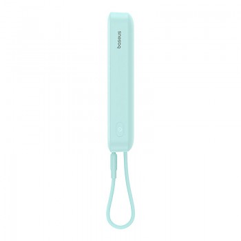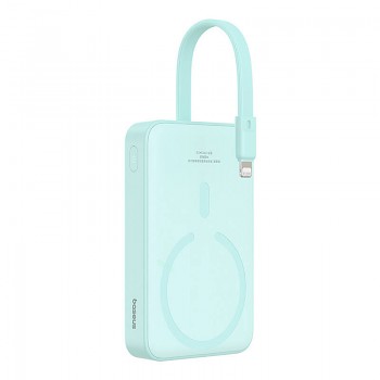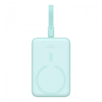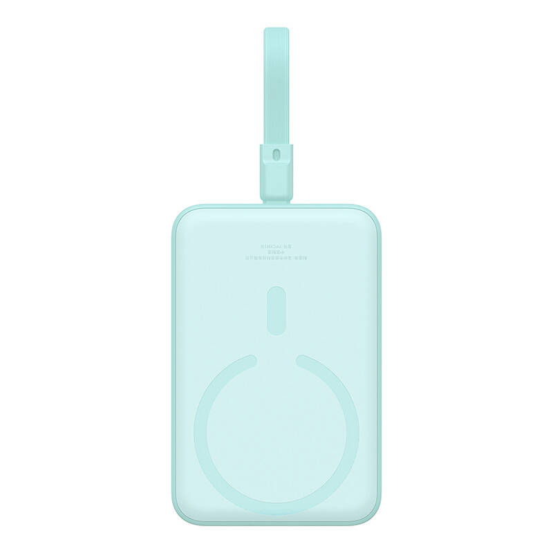 Tato power banka zaujme svým minimalistickým a moderním designem v osvěžující mátové barvě. Její kompaktní obdélníkový tvar se zaoblenými hranami a hladkým matným povrchem zajišťuje příjemné držení a snadnou přenositelnost. Na jedné straně dominuje výrazná kruhová magnetická plocha, která je optimalizována pro bezpečné a efektivní bezdrátové nabíjení MagSafe. Praktickým prvkem je také integrovaný Lightning kabel, který je elegantně zasunut do těla power banky, připraven k okamžitému použití. Na boku naleznete USB-C port pro univerzální nabíjení a dobíjení samotné power banky, spolu s LED indikátory, které vás informují o aktuálním stavu baterie, a diskrétním tlačítkem napájení.