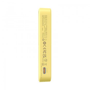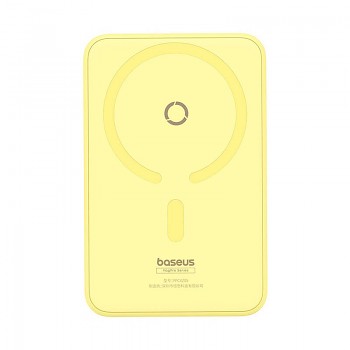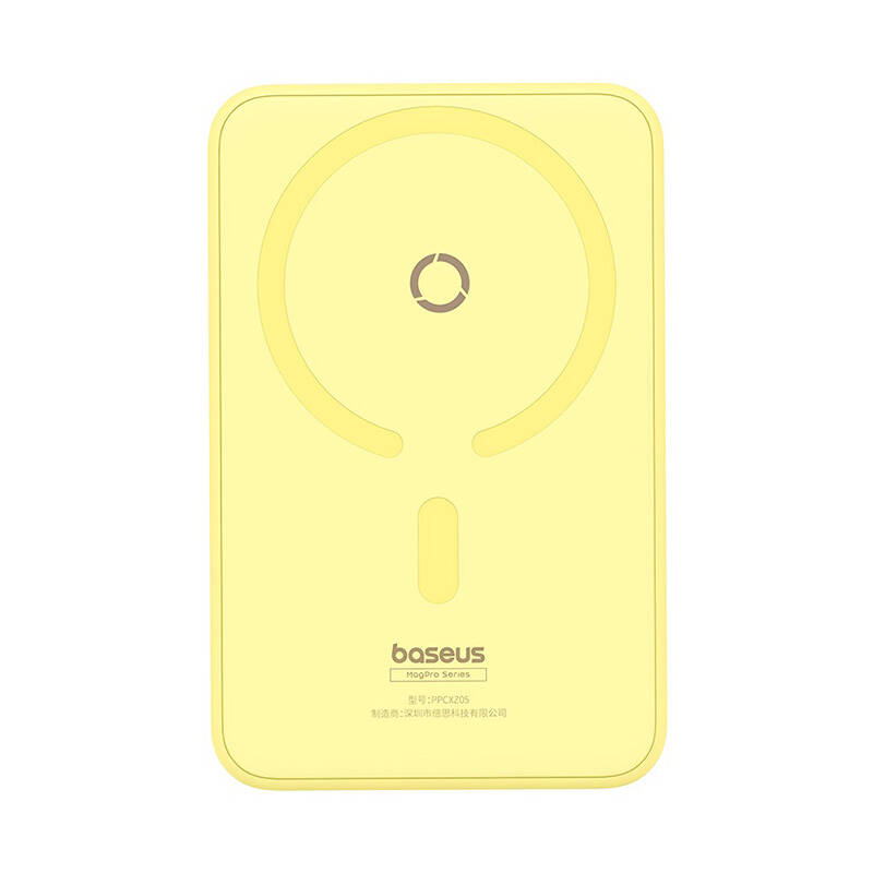Power banka Baseus MagPro se pyšní minimalistickým a elegantním designem. Její tenké, obdélníkové tělo v atraktivní žluté barvě je příjemné na dotek a snadno se vejde do každé tašky či kapsy. Na přední straně dominuje magnetický nabíjecí kruh, který zajišťuje perfektní přilnutí k vašemu telefonu díky technologii MagSafe. Pod ním se nachází decentní oválná prohlubeň a logo Baseus, které podtrhuje prémiový vzhled produktu.