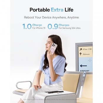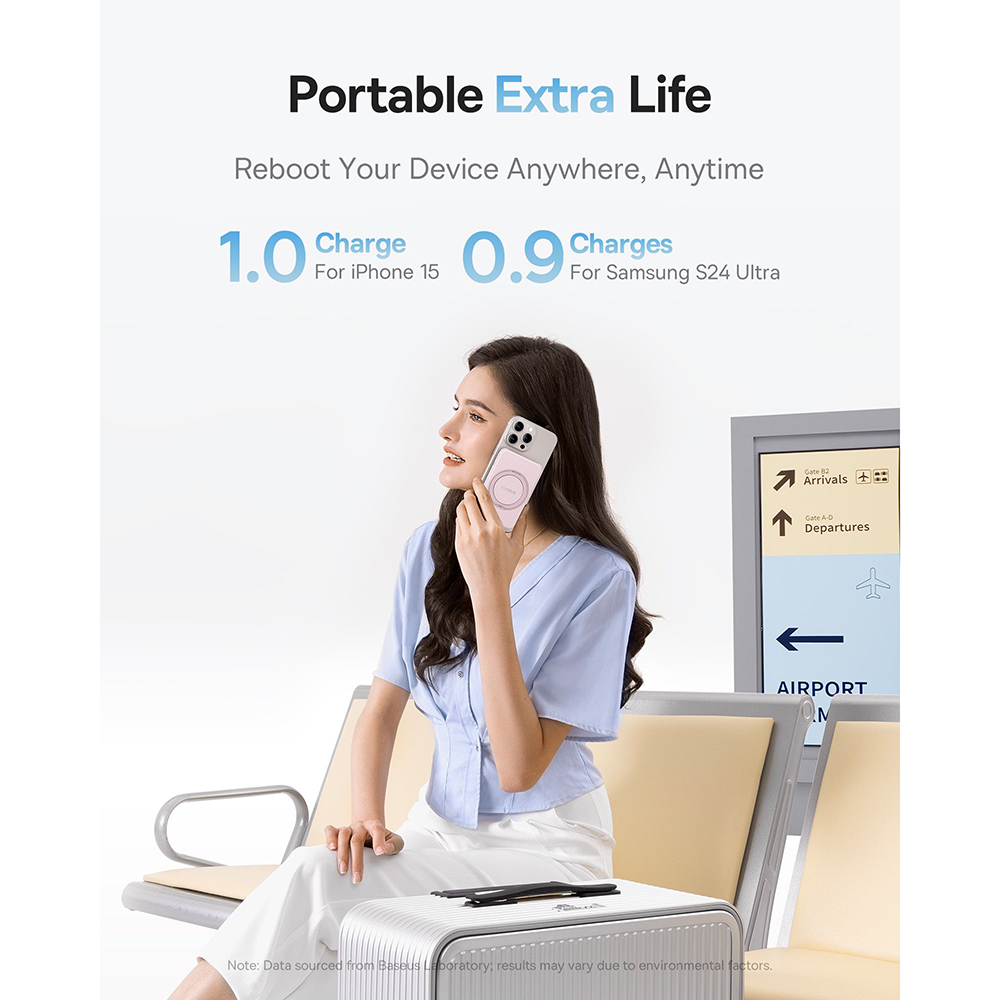 Power banka Baseus PicoGo se pyšní minimalistickým a sofistikovaným designem. Její hladké, zaoblené hrany a matný povrch v něžné růžové barvě působí velmi elegantně a příjemně na dotek. Na zadní straně se nachází výrazný kruhový magnetický modul pro bezdrátové nabíjení, který zajišťuje pevné a stabilní připojení k vašemu telefonu. Inovativní otočný stojánek, diskrétně integrovaný do těla power banky, umožňuje pohodlné umístění telefonu ve vertikální i horizontální poloze, což z ní činí ideálního společníka nejen pro nabíjení, ale i pro zábavu a práci. Na boku naleznete USB-C port pro rychlé drátové nabíjení a dobíjení samotné power banky, doplněný o LED indikátory stavu baterie.