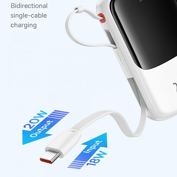 Tato power banka se pyšní minimalistickým a moderním designem v čistě bílé barvě, který doplňují zaoblené hrany pro pohodlné držení. Její kompaktní rozměry umožňují snadné přenášení v kapse či tašce. Jedinečným prvkem je integrovaný kabel Type-C, který je elegantně zasunut do těla power banky a tvoří praktické poutko. Díky tomu máte nabíjecí kabel vždy po ruce a nemusíte se obávat jeho ztráty. Na přední straně naleznete přehledný digitální displej, který vás informuje o aktuálním stavu nabití baterie v procentech a o aktuálním výkonu 22.5W, což zajišťuje maximální kontrolu a přehled.