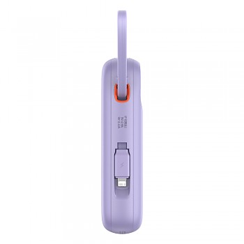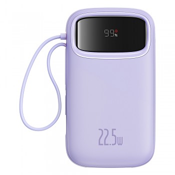 Powerbanka Baseus Qpow Pro+ zaujme svým minimalistickým a zaobleným designem v atraktivní fialové barvě. Její kompaktní rozměry a nízká hmotnost zajišťují snadné přenášení v kapse či tašce. Klíčovým prvkem jsou integrované nabíjecí kabely – jeden s konektorem USB-C a druhý s konektorem Lightning – což eliminuje potřebu nosit s sebou další kabely. Na přední straně se nachází přehledný digitální displej, který v reálném čase zobrazuje zbývající kapacitu baterie v procentech. Praktické poutko usnadňuje manipulaci a přenášení.
