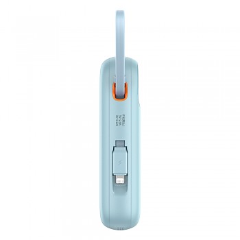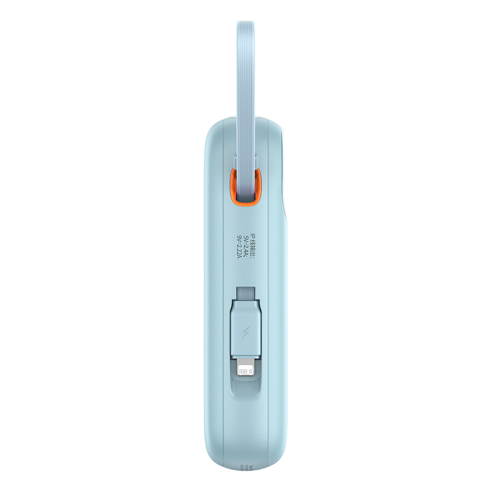 Tato powerbanka zaujme na první pohled svým moderním a minimalistickým designem. Její kompaktní, obdélníkové tělo s jemně zaoblenými hranami se pohodlně drží v ruce a snadno se vejde do každé tašky či batohu. Světle modrá barva dodává zařízení svěží a stylový vzhled. Dominantou je digitální displej, který přehledně zobrazuje zbývající procenta baterie a aktuální nabíjecí výkon až 22.5W, takže máte vždy dokonalý přehled o stavu nabíjení.