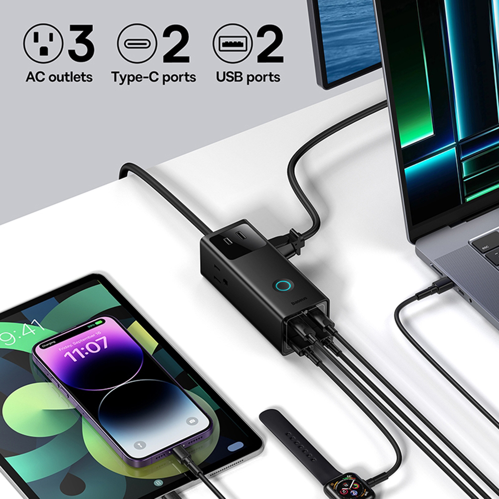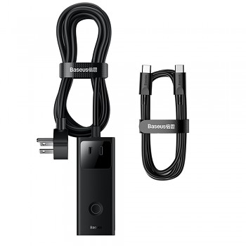 Baseus PowerCombo se pyšní minimalistickým a moderním designem v matně černé barvě, který se dokonale hodí do každého interiéru. Jeho kompaktní obdélníkový tvar šetří místo a zajišťuje snadnou přenositelnost. Na horní straně se nachází decentní kruhová LED indikace, která signalizuje stav zařízení. Všechny porty jsou chytře rozmístěny pro snadný přístup a efektivní správu kabelů, což přispívá k celkově čistému a organizovanému pracovnímu prostoru.