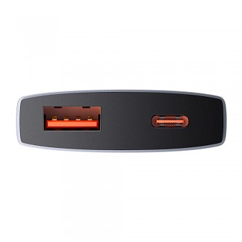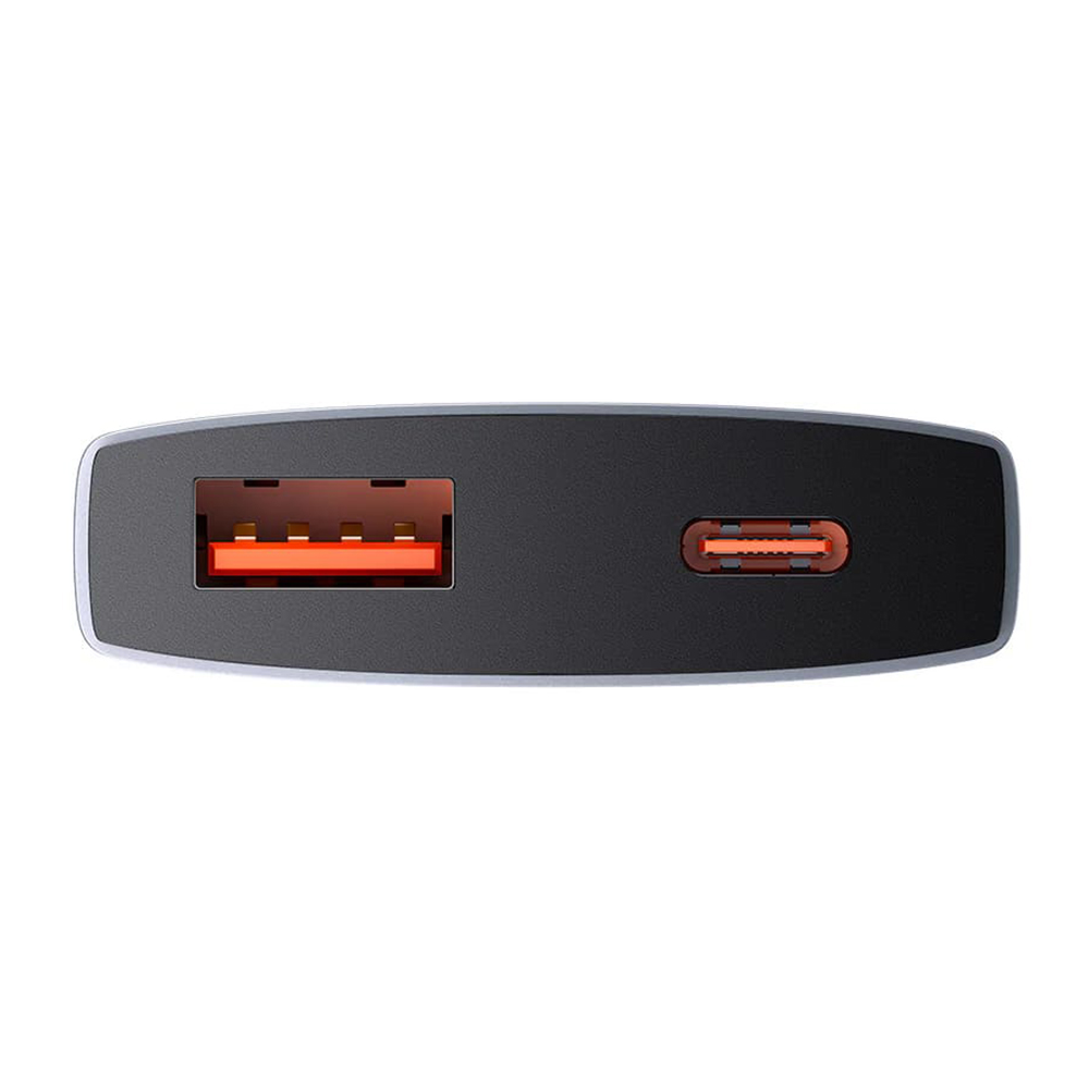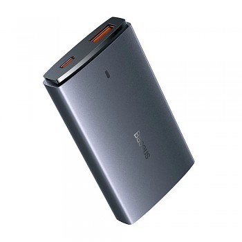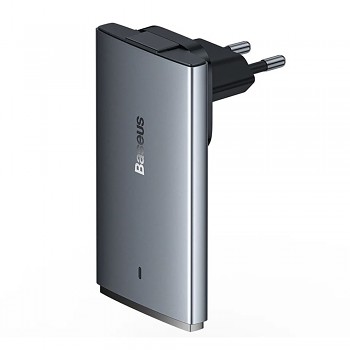 Nabíječka Baseus GaN5 Pro se pyšní minimalistickým a moderním designem. Její štíhlé a kompaktní tělo v elegantní šedé barvě s matným povrchem působí velmi sofistikovaně. Na přední straně je decentně umístěno logo Baseus, které podtrhuje prémiový vzhled. Díky svým rozměrům je nabíječka ideální na cesty, snadno se vejde do batohu či kabelky. Na spodní straně se nachází dva USB-C porty, které jsou diskrétně integrovány do celkového designu.