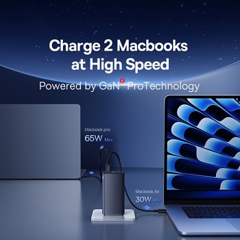 Nabíječka Baseus GaN6 Pro se pyšní elegantním a minimalistickým designem v matně černé barvě, který se skvěle hodí do každého interiéru. Její kompaktní obdélníkový tvar s jemně zaoblenými hranami zajišťuje, že nezabere mnoho místa a je ideální pro cestování. Na horní straně naleznete čtyři nabíjecí porty – dva USB-A a dva USB-C, chytře uspořádané pro snadný přístup. Decentní modrá LED dioda na boku indikuje stav nabíjení, zatímco vertikálně umístěné logo Baseus dodává zařízení prémiový vzhled. Součástí balení je i kvalitní 1m USB-C kabel ve stejné černé barvě, který je prakticky svázán značkovým páskem.