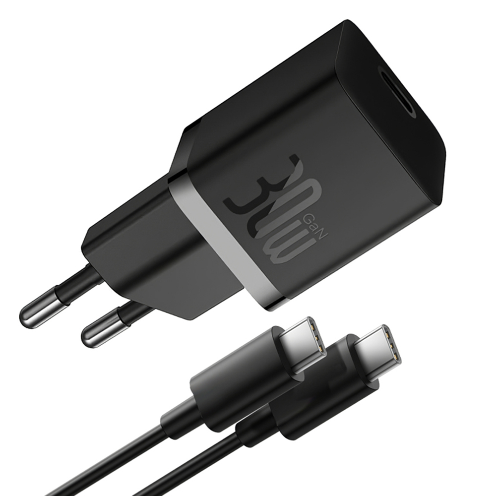 Design nabíječky Baseus P10110902113-00 je ztělesněním minimalismu a praktičnosti. Její kompaktní a hranatý tvar s matným černým povrchem působí velmi moderně a diskrétně. Na boku nabíječky je decentně vyveden nápis "30W GaN", který podtrhuje její technologickou vyspělost. Díky svým malým rozměrům se snadno vejde do každé tašky či batohu, což z ní činí ideálního společníka na cesty i pro každodenní použití doma či v kanceláři. Kabel USB-C na USB-C je rovněž v černé barvě a dokonale ladí s nabíječkou, což vytváří ucelený a esteticky příjemný celek.