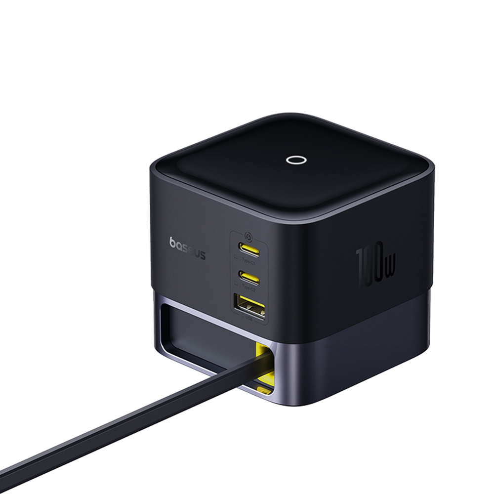 Nabíječka Baseus Super GaN 100W se pyšní minimalistickým a moderním designem. Její kompaktní, čtvercový tvar v kosmické černé barvě s matným povrchem se skvěle hodí do každého interiéru. Na přední straně naleznete dva porty USB-C a jeden port USB-A, které jsou pro snadnou orientaci zvýrazněny žlutými akcenty. Unikátním prvkem je integrovaný výsuvný USB-C kabel, který je elegantně uložen v základně nabíječky, což eliminuje nepořádek a zajišťuje, že máte vždy po ruce ten správný kabel. Celkový výkon 100W je decentně vyznačen na boku zařízení. Součástí balení je také napájecí kabel o délce 1,5 metru pro připojení do elektrické sítě.