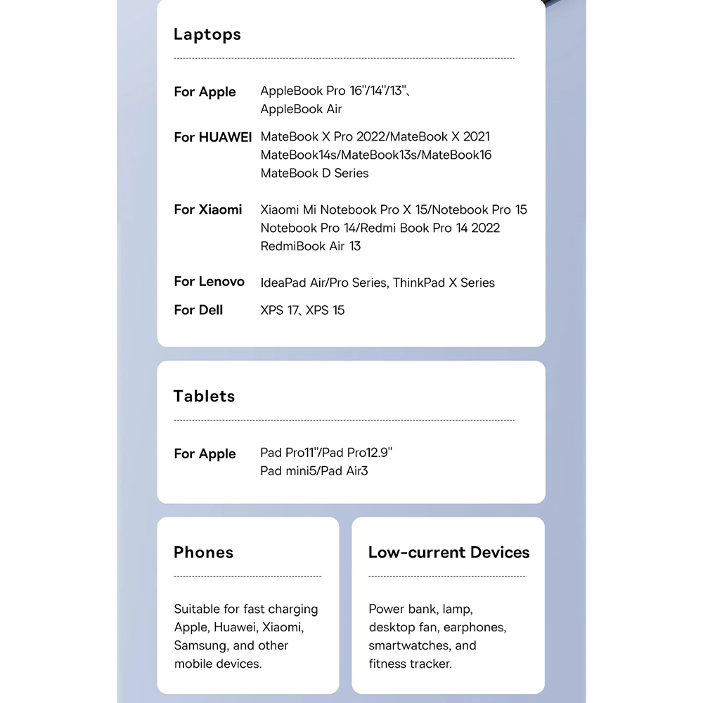 Tato nabíječka je univerzálně kompatibilní a ideální pro rychlé nabíjení široké škály zařízení, včetně notebooků (např. AppleBook Pro, Huawei MateBook, Xiaomi Mi Notebook Pro, Lenovo ThinkPad, Dell XPS), tabletů (např. Apple iPad Pro, iPad Air), chytrých telefonů (Apple, Huawei, Xiaomi, Samsung a další mobilní zařízení) a nízko proudových zařízení, jako jsou powerbanky, sluchátka, chytré hodinky a fitness trackery.
