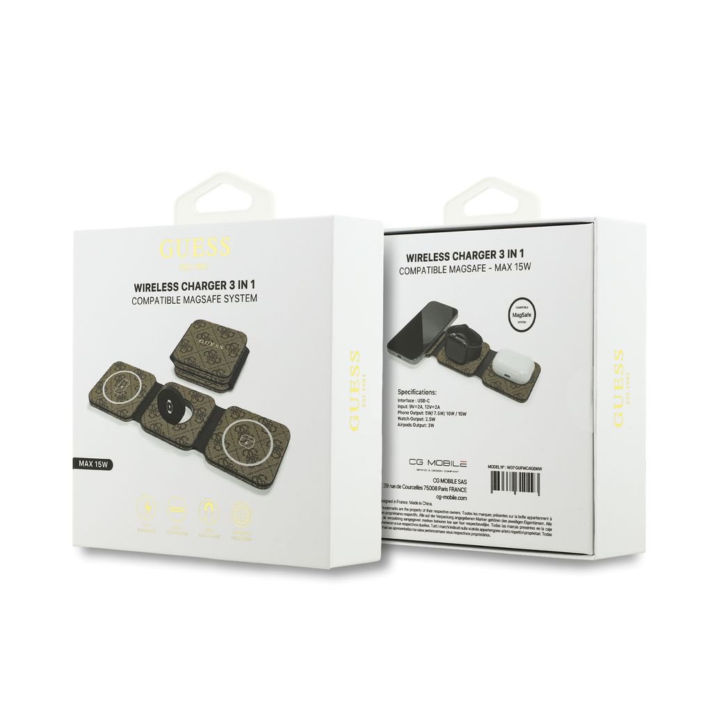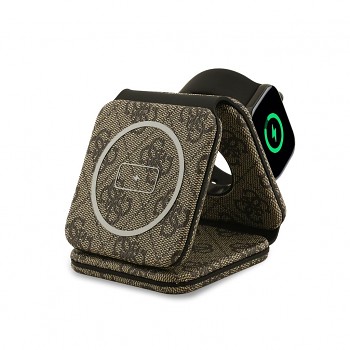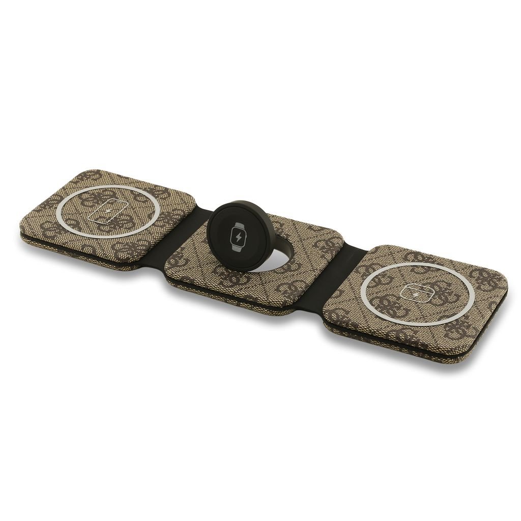 Bezdrátová nabíječka Guess PU 4G MagSafe 3v1 hnědáDesign: Luxusní skládací nabíjecí podložka zdobená nezaměnitelným vzorem 4G a ikonickým zlatavým logem značky Guess.