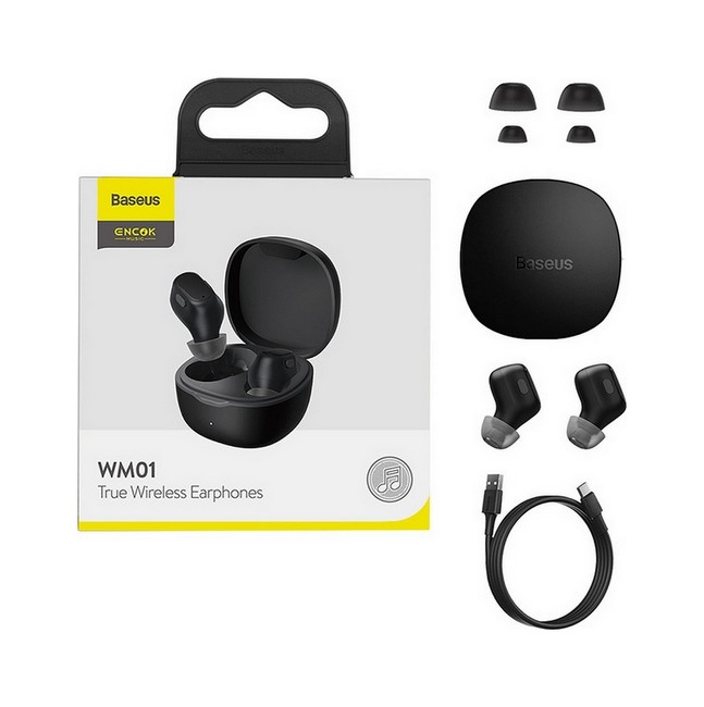 Balení obsahuje bezdrátová sluchátka Baseus WM01, nabíjecí stanici Baseus, nabíjecí kabel USB-C, silikonové nástavce ve více velikostech.
