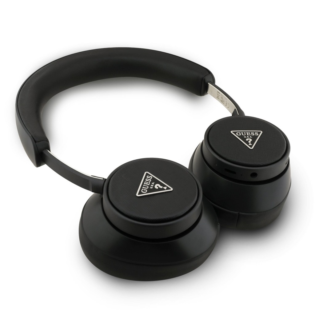 Sluchátka Guess se pyšní elegantním černým provedením, které je doplněno o ikonické logo Guess ve tvaru trojúhelníku. Tento designový prvek je nejen stylový, ale také dodává sluchátkům jedinečný charakter. Vzor Saffiano, který je na sluchátkách použit, je známý svou odolností a luxusním vzhledem, což zaručuje, že budete vypadat skvěle, ať už jste kdekoli.