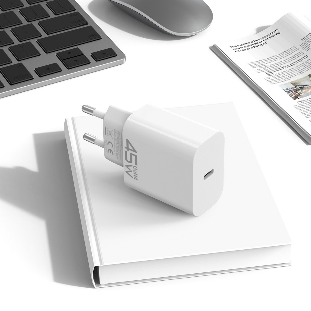 Tato nabíječka je vybavena USB Type-C PD 45W portem, který zajišťuje rychlé a stabilní nabíjení smartphonů, tabletů, notebooků a dalších mobilních zařízení. S pokročilou technologií GaN4, nejnovější 4. generací nitridu galia, dosahuje nabíječka vyšší energetické účinnosti, minimalizuje tvorbu tepla a umožňuje extrémně kompaktní rozměry (82 × 43 × 26 mm), což z ní činí ideálního společníka na cesty.