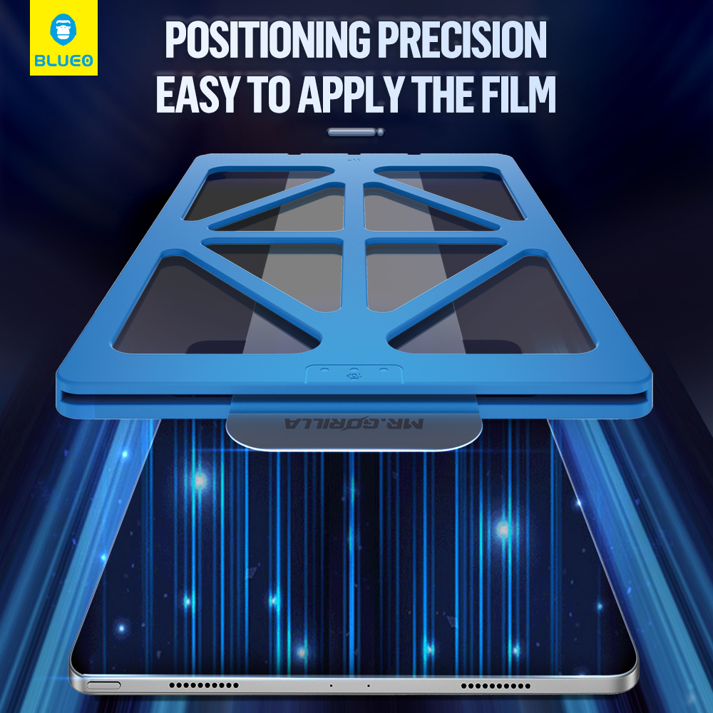 Design tvrzeného skla Blueo je promyšlen do posledního detailu. Sklo je tenké, ale zároveň extrémně odolné, s precizně zaoblenými hranami, které zajišťují pohodlné používání a zabraňují zachytávání. Součástí balení je inovativní aplikátor v modré barvě, který zaručuje jednoduchou a přesnou instalaci bez bublin. Díky aplikátoru umístíte sklo na displej vašeho iPadu dokonale rovně a bez námahy, což ocení i méně zkušení uživatelé. Na skle je také viditelný nápis "MR. GORILLA", který symbolizuje jeho výjimečnou pevnost a odolnost.