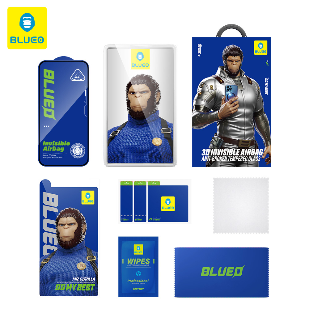 Toto ochranné sklo se vyznačuje černým provedením, které se dokonale snoubí s rámečkem vašeho telefonu. Jeho full-cover design zajišťuje ochranu od okraje k okraji, včetně zaoblených částí displeje, což je klíčové pro moderní smartphony. Díky technologii „Invisible Airbag“ a úzkým TPU okrajům je sklo navrženo tak, aby absorbovalo nárazy a minimalizovalo riziko poškození displeje při pádu. Sklo je tenké, ale extrémně odolné, a zachovává tak původní citlivost dotyku a jas displeje. Balení produktu, často zdobené motivem "Mr. Gorilla", podtrhuje robustnost a spolehlivost, kterou značka Blueo nabízí.
