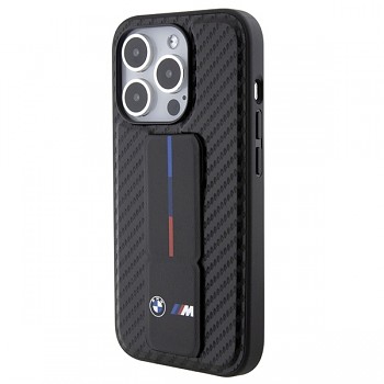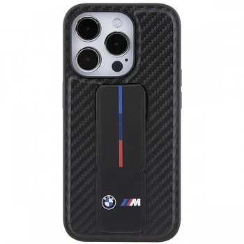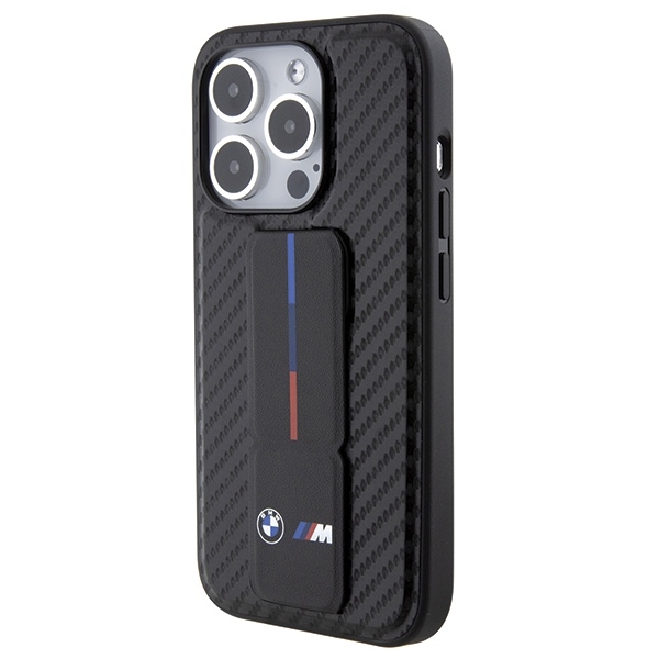Kryt se pyšní sofistikovaným designem v elegantní černé barvě, který kombinuje texturu karbonového vlákna na zadní straně s hladkými, pravděpodobně koženými nebo kožence podobnými, detaily. Dominantním prvkem je integrovaný grip stand ve střední části, který je zdoben ikonickými tříbarevnými pruhy BMW M (modrá, tmavě modrá, červená) a decentním logem BMW M. Tento prvek nejenže dodává krytu sportovní šmrnc, ale zároveň slouží jako praktický stojánek pro pohodlné sledování obsahu nebo jako bezpečný úchop telefonu. Přesné výřezy zajišťují snadný přístup ke všem portům a tlačítkům, zatímco zvýšené okraje chrání displej a kameru před poškrábáním. Kombinace odolných materiálů zaručuje dlouhou životnost a spolehlivou ochranu vašeho zařízení.