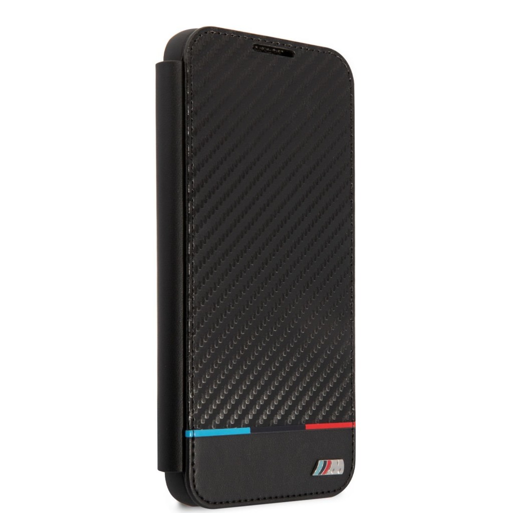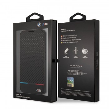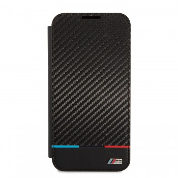 BMW M Book Carbon Stripe prémiový ochranný kryt na telefon se zavíráním do boku a motivem karbonu na čelní straně.