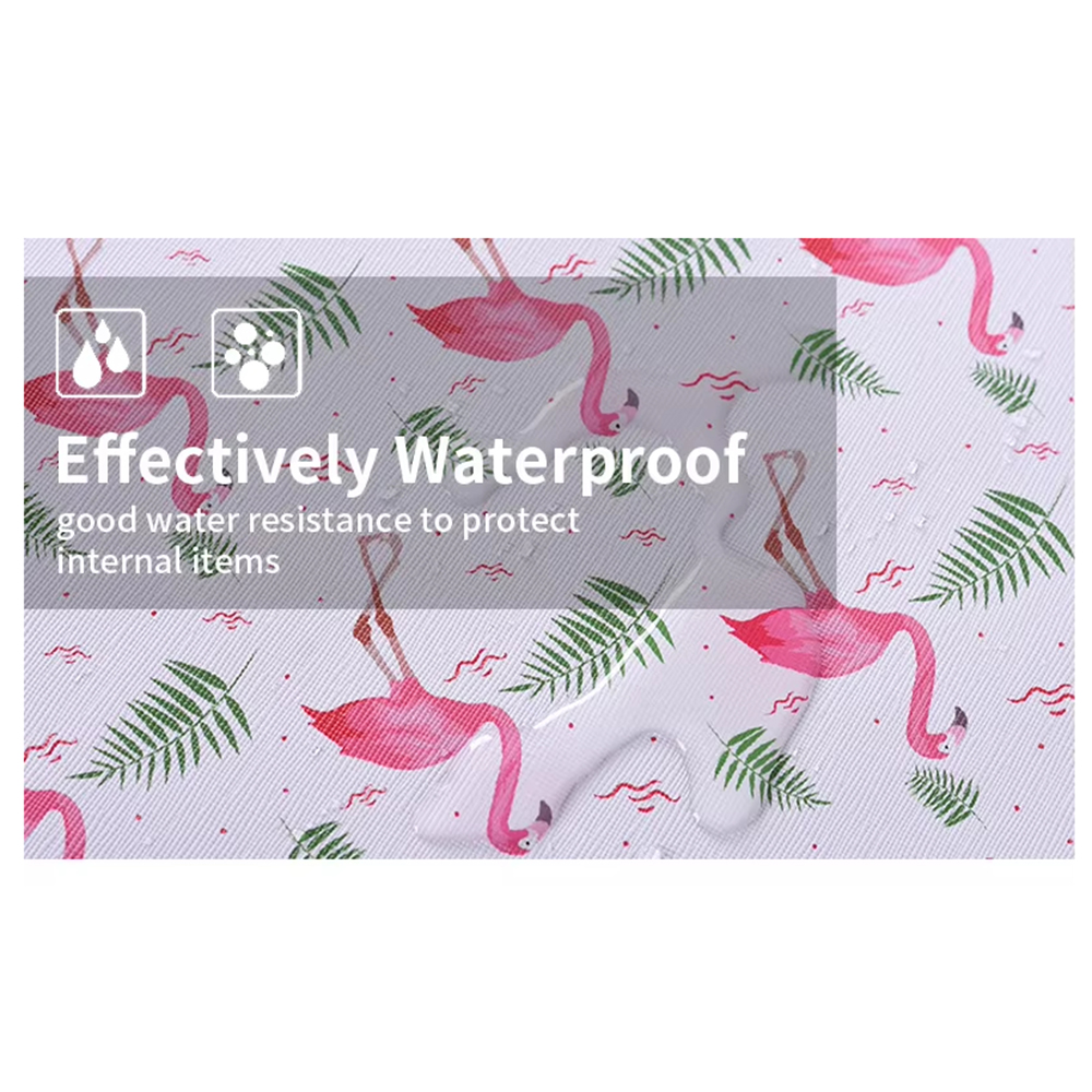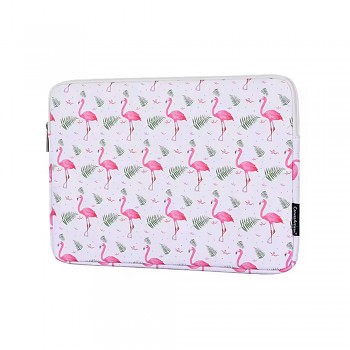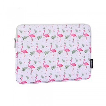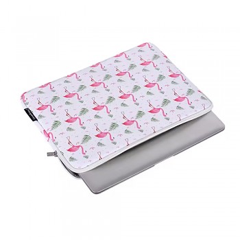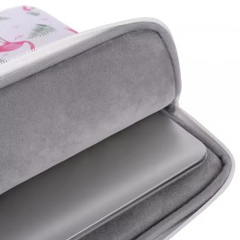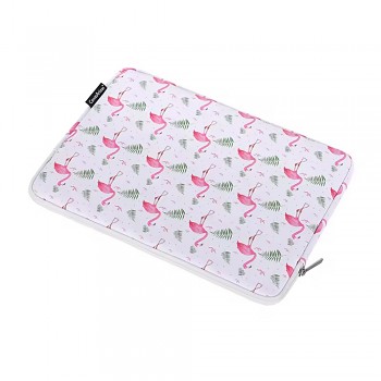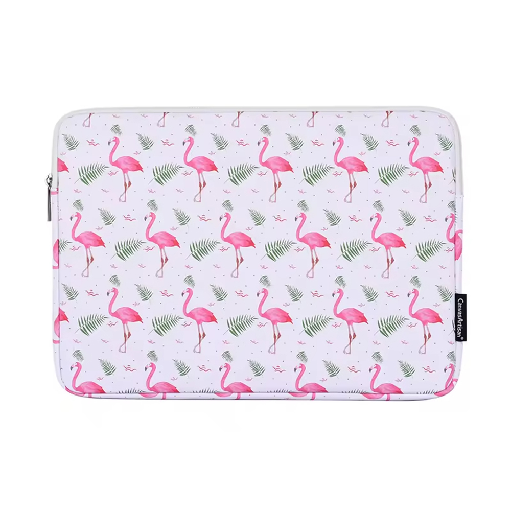 Pouzdro CanvasArtisan G57-01 zaujme na první pohled svým hravým a svěžím designem. Bílý podklad zdobí opakující se vzor růžových plameňáků a zelených kapradinových listů, který dodává pouzdru exotický a moderní vzhled. Vnitřní část pouzdra je vyrobena z měkkého, plyšového materiálu v elegantní šedé barvě, který chrání tablet před poškrábáním a tlumí nárazy. Vnější povrch je navíc efektivně voděodolný, což zajišťuje ochranu obsahu před vlhkostí a drobnými nehodami. Kvalitní zip v bílé barvě zajišťuje snadný přístup a bezpečné uzavření.