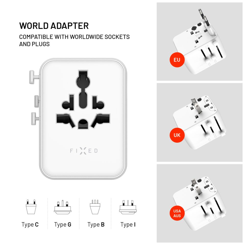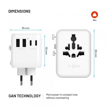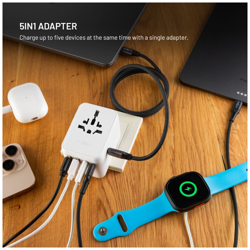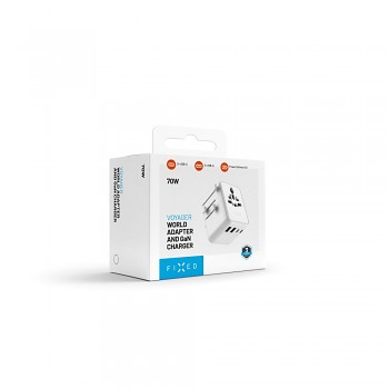 Cestovní adaptér FIXED Voyager 70W pro EU, UK a USA/AUS, s 3xUSB-C a 2xUSB výstupem, GaN, PD 70W, bílýKonec cestovatelského chaosu! Seznamte se s vaším novým nejlepším přítelem na cesty! Už vás nebaví před každou cestou prohrabávat šuplík plný zamotaných kabelů a hledat ten správný adaptér? Balíte pět různých nabíječek pro telefon, notebook, hodinky, sluchátka a tablet?