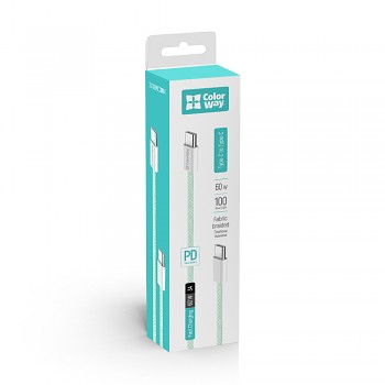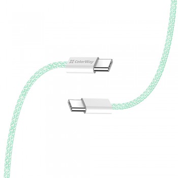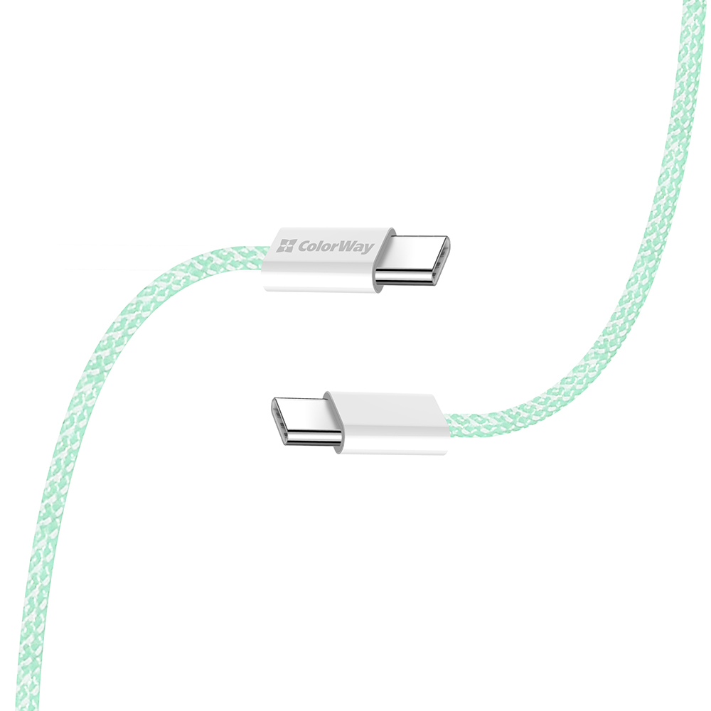 Kabel ColorWay CW-CBPDCC061-G se pyšní nejen svými technickými specifikacemi, ale také promyšleným designem. Jeho tělo je potaženo odolným pleteným textilem v elegantním odstínu svěží mátově zelené, což mu dodává nejen moderní vzhled, ale také zvyšuje jeho odolnost proti zamotání a opotřebení. Robustní bílé konektory USB-C jsou precizně zpracované a na jedné straně hrdě nesou logo ColorWay, což podtrhuje kvalitu a pozornost k detailům.