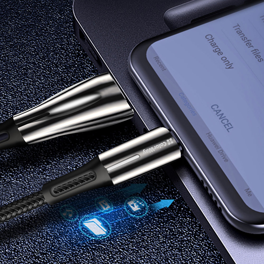 Kabel ColorWay se pyšní moderním a robustním designem. Jeho tělo je potaženo odolným opletením v černé barvě, které efektivně zabraňuje zamotávání a zvyšuje mechanickou odolnost proti ohybu a lomu. Konektory jsou vyrobeny z kvalitního plastu v kombinaci s kovovými prvky, což zajišťuje pevné a spolehlivé připojení. Na konektoru Type-C je decentně umístěno logo značky ColorWay, které podtrhuje jeho prémiový vzhled. Celkový dojem je minimalistický a funkční, ideální pro každodenní intenzivní používání.