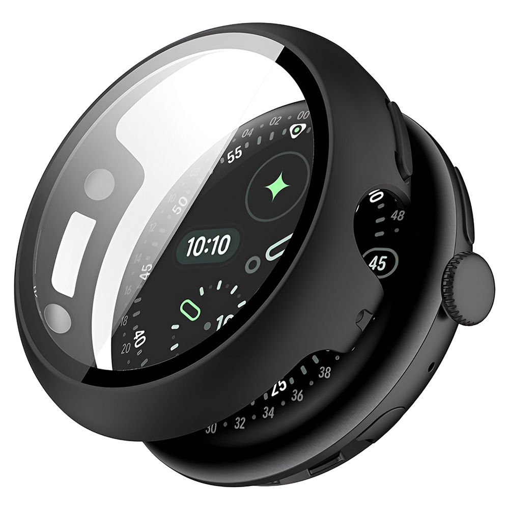 Pouzdro se skládá ze dvou částí, které do sebe dokonale zapadají a vytvářejí pevný a odolný štít. Přední část obsahuje integrované tvrzené sklo s tvrdostí 9H, které chrání displej, aniž by omezovalo citlivost dotyku. Zadní část z flexibilního polyuretanu (TPU) a tvrdého polykarbonátu (PC) efektivně tlumí pády. Precizní výřezy zajišťují snadný přístup ke všem tlačítkům a senzorům. Matně černý povrch dodává hodinkám moderní a decentní vzhled.