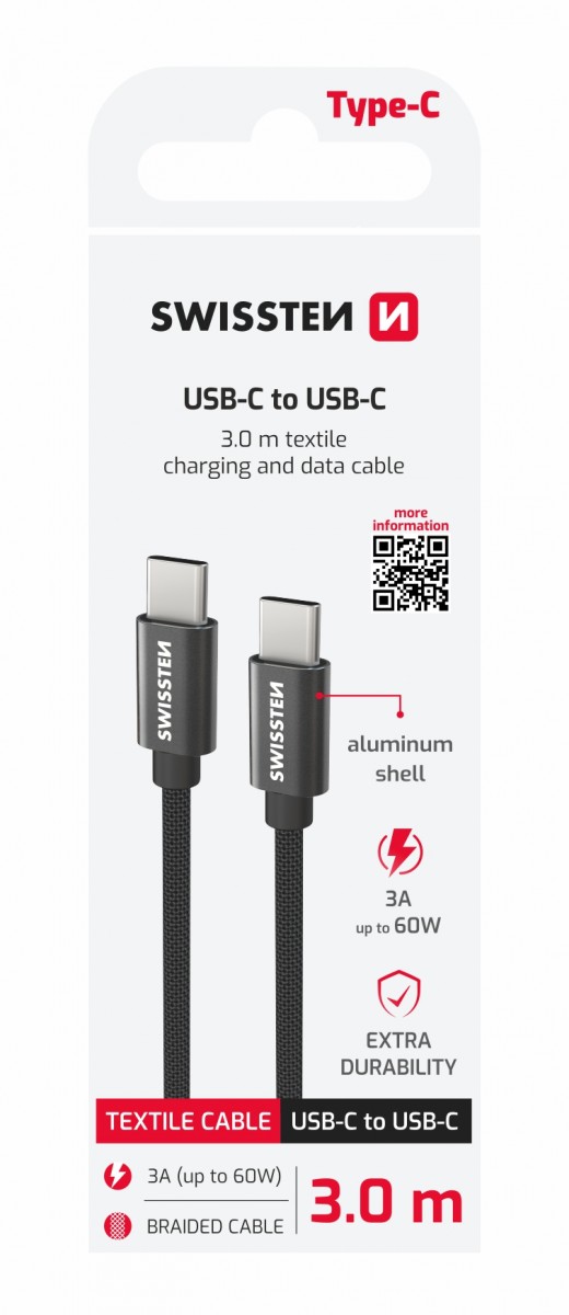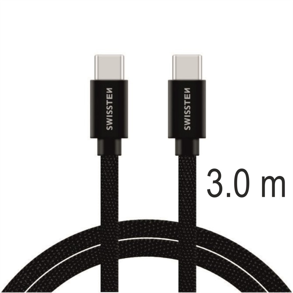 Datový kabel Swissten textile usb-c / usb-c 3.0 m černýOdolný datový kabel pro každodenní používání. Díky nadstandardní délce nabízí absolutní svobodu pohybu a vyniká odolností testovanou na více než 1 000 ohybů.