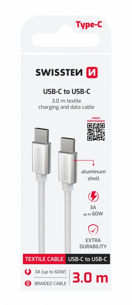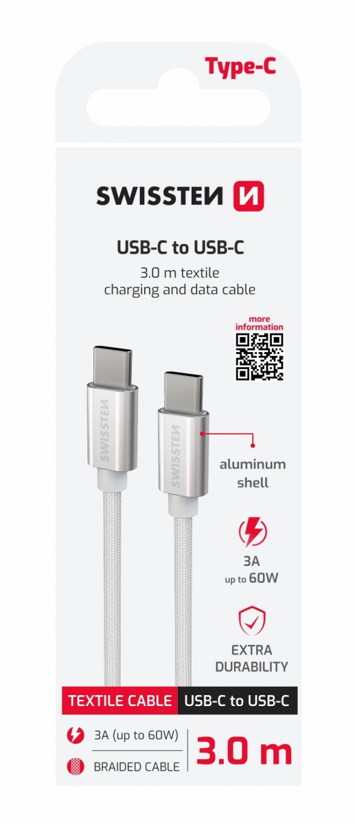 Datový kabel Swissten textile usb-c / usb-c 3.0 m stříbrnýOdolný datový kabel pro každodenní používání. Díky nadstandardní délce nabízí absolutní svobodu pohybu a vyniká odolností testovanou na více než 1 000 ohybů.