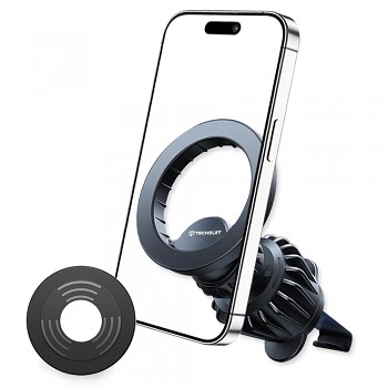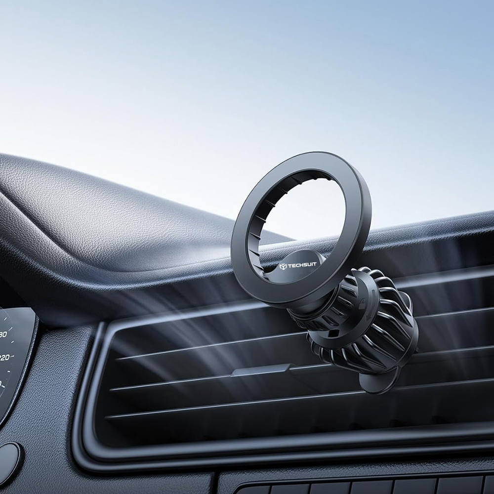 Držák Techsuit AirFix (S1) se pyšní robustní konstrukcí a promyšleným designem. Jeho hlavní předností je inovativní upevnění do ventilační mřížky, které využívá vylepšený kovový háček a silikonové protiskluzové prvky pro extrémní stabilitu. Díky trojúhelníkové podpoře je kompatibilní s 99 % vertikálních i horizontálních ventilačních mřížek. Telefon je k držáku připevněn pomocí silného magnetického mechanismu, který je integrován do elegantního kruhového prstence. Součástí balení je i přídavný kovový kroužek, který umožňuje magnetické uchycení i pro telefony bez vestavěné magnetické funkce. Celý držák je vyveden v matné černé barvě, která podtrhuje jeho minimalistický a prémiový vzhled.