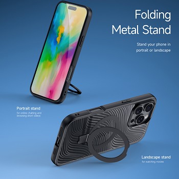 Pouzdro Dux Ducis Aimo v elegantní černé barvě se pyšní moderním a minimalistickým vzhledem. Zadní strana je zdobena jemným vlnitým texturovaným vzorem, který nejenže dodává pouzdru jedinečný charakter, ale také zlepšuje úchop a minimalizuje otisky prstů. Integrovaný MagSafe kompatibilní kroužek na zadní straně zajišťuje pevné a bezpečné připojení k veškerému MagSafe příslušenství. Jeho největší předností je však skládací kovový stojánek, který je diskrétně zabudován do kroužku. Ten vám umožní pohodlně postavit telefon jak ve vertikální, tak i horizontální poloze, ideální pro videohovory, sledování filmů nebo prohlížení obsahu.