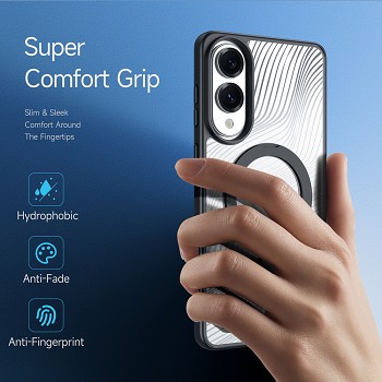 Pouzdro Dux Ducis Aimo se pyšní průhledným designem, který nechá vyniknout originální krásu vašeho Samsung Galaxy S25 Edge. Zadní strana je zdobena jemným vlnitým vzorem, který dodává pouzdru moderní a sofistikovaný vzhled, zatímco černý rámeček elegantně lemuje okraje telefonu a zajišťuje pevné uchopení.
