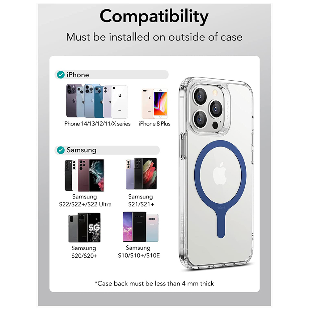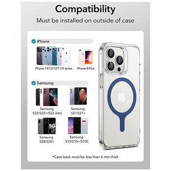 Produkt je určen pro telefony iPhone (řady 14/13/12/11/X a iPhone 8 Plus) a Samsung (řady S22/S22+/S22 Ultra, S21/S21+, S20/S20+, S10/S10+/S10E) a další smartphony s podporou bezdrátového nabíjení, které chcete vybavit MagSafe kompatibilitou. Adaptér musí být instalován na vnější stranu pouzdra, jehož tloušťka zadní části nesmí přesáhnout 4 mm.