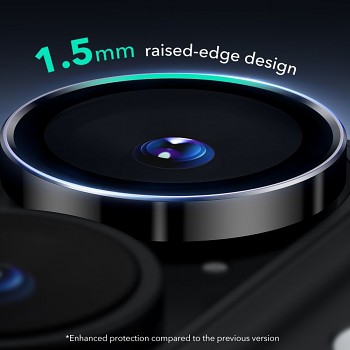 Ochranné kryty na objektiv ESR Armorite představují špičkové řešení pro ochranu fotoaparátu vašeho iPhonu. Každý objektiv je chráněn samostatným krytem, což zajišťuje maximální odolnost a spolehlivost oproti jednodílným řešením. Design se vyznačuje černým provedením s elegantními kovovými kroužky kolem každého objektivu, které dodávají telefonu sofistikovaný vzhled. Díky zvýšenému okraji o 1,5 mm poskytují kryty dodatečnou ochranu proti poškrábání a nárazům.