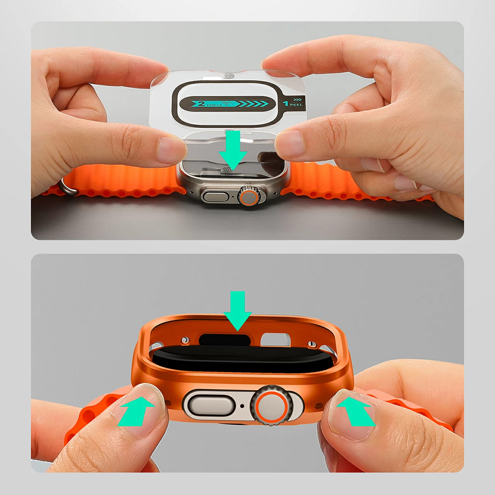Pouzdro je navrženo s přesnými výřezy, které zajišťují plný přístup ke všem funkcím hodinek, včetně digitální korunky, bočního tlačítka, mikrofonu a reproduktoru, aniž by omezovalo jejich použitelnost. Zvýšené okraje kolem displeje poskytují dodatečnou ochranu proti přímým nárazům a pádům, čímž minimalizují riziko poškození obrazovky. Celkový vzhled je robustní a sportovní, ideální pro aktivní životní styl.