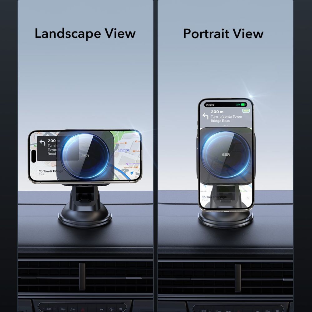 Držák ESR Car Holder se pyšní moderním a minimalistickým designem v matně černé barvě, který se dokonale hodí do interiéru každého vozu. Jeho robustní konstrukce zajišťuje stabilní uchycení na palubní desku pomocí silné přísavky, která je doplněna o nastavitelný kloub pro optimální polohování. Nabíjecí plocha je elegantně integrována a zvýrazněna zeleným podsvícením s logem Qi2, což podtrhuje jeho technologickou vyspělost. Kompaktní rozměry a promyšlené detaily, jako je diskrétní logo ESR, dodávají produktu prémiový vzhled.