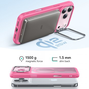 Pouzdro ESR Classic Hybrid HaloLock Kickstand se pyšní promyšleným designem, který podtrhuje krásu vašeho iPhone 17 Pro. Růžový matný rám elegantně doplňuje křišťálově čistá záda, která jsou odolná proti žloutnutí a nechávají vyniknout originální design telefonu. Klíčovou inovací je integrovaný kovový stojánek, chytře umístěný kolem modulu fotoaparátu, který umožňuje pohodlné sledování obsahu v režimu na šířku i na výšku.