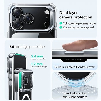 Ochrana vašeho zařízení je prioritou. Kryt nabízí trojnásobnou ochranu vojenské úrovně (MIL-STD-810H 516.8) a je testován na odolnost proti pádům z výšky až 3,3 metru (11 ft). Speciální dvouvrstvá ochrana fotoaparátu zahrnuje plné pokrytí modulu a ochranný prvek ze slitiny zinku. Zvýšené okraje o 2,4 mm kolem fotoaparátu a 1,2 mm kolem displeje poskytují dodatečnou ochranu proti poškrábání a nárazům. Pro maximální absorpci nárazů jsou rohy krytu vybaveny technologií Air Guard.
