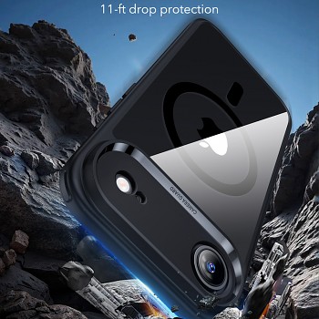 Kryt ESR Classic Hybrid HaloLock se vyznačuje křišťálově čistými zády, která nechávají vyniknout originální design a barvu vašeho iPhone 17 Air. Průhledná zadní část je doplněna elegantními černými okraji, které dodávají krytu sofistikovaný vzhled a zároveň zajišťují pevný úchop. Okolo modulu fotoaparátu je integrována zvýšená černá ochrana s nápisem "CAMERA GUARD", která chrání čočky před poškrábáním a nárazy. Na zadní straně je viditelný kruhový magnetický prstenec, který je klíčovým prvkem patentovaného systému HaloLock™.
