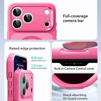 Rámeček krytu, stejně jako zvýšená ochrana kolem modulu fotoaparátu, je v identickém matně růžovém odstínu. Kryt poskytuje 3x vojenskou ochranu proti pádům, testovanou až do výšky 3,3 metru (11 stop). Zvýšené okraje o 1,2 mm chrání displej a 0,8 mm zvýšený rámeček kolem fotoaparátu zajišťuje maximální bezpečí pro objektivy. Díky technologii Air Guard Corners jsou rohy krytu vybaveny vzduchovými polštářky absorbujícími nárazy, což minimalizuje riziko poškození při pádech. Navzdory robustní ochraně si kryt zachovává štíhlý profil a originální pocit z držení telefonu.