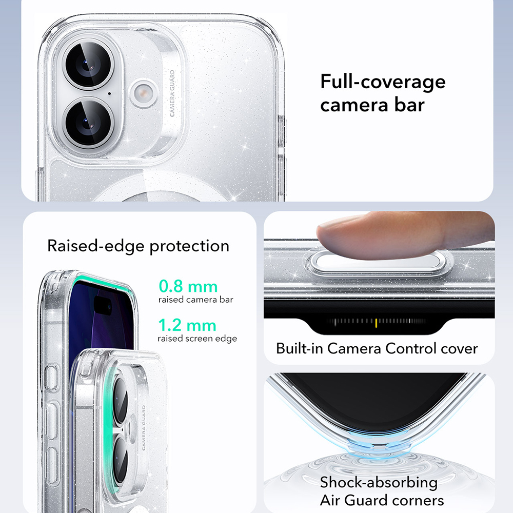 ESR Classic Hybrid HaloLock pro iPhone 17 v čiré třpytivé barvěPředstavujeme ESR Classic Hybrid HaloLock, dokonalou kombinaci stylu a ochrany pro váš iPhone 17. Tento kryt je navržen tak, aby nejen chránil váš telefon, ale také podtrhl jeho elegantní design s nádechem třpytivé extravagance.