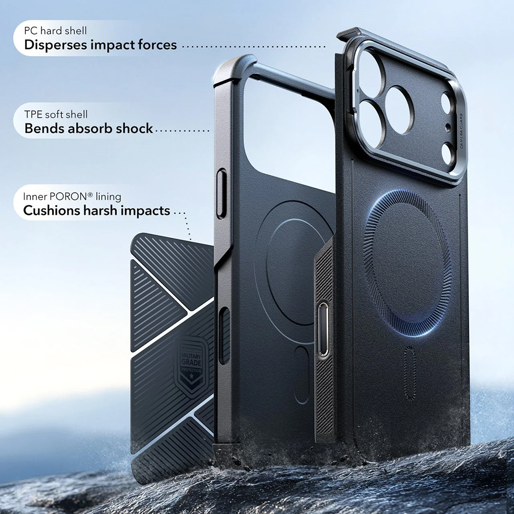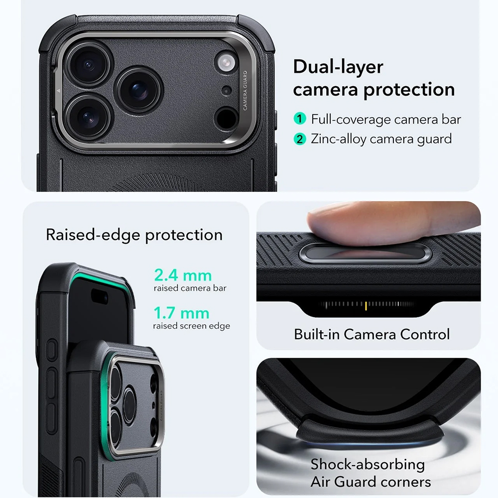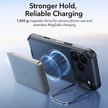 Kryt ESR Cyber Armor Kickstand se vyznačuje odolným a funkčním designem. Jeho matný, texturovaný povrch zajišťuje pevný úchop a minimalizuje klouzání. Zesílené rohy a zvýšené okraje kolem displeje a modulu fotoaparátu poskytují špičkovou ochranu proti pádům a poškrábání. Integrovaný kovový stojánek, diskrétně umístěný na spodní hraně, umožňuje pohodlné sledování obsahu v horizontální poloze, ať už jste kdekoli. Zadní strana krytu je vybavena HaloLock™ technologií, ekvivalentem MagSafe, která zaručuje silné a bezpečné uchycení k veškerému MagSafe příslušenství, včetně bezdrátových nabíječek a držáků.