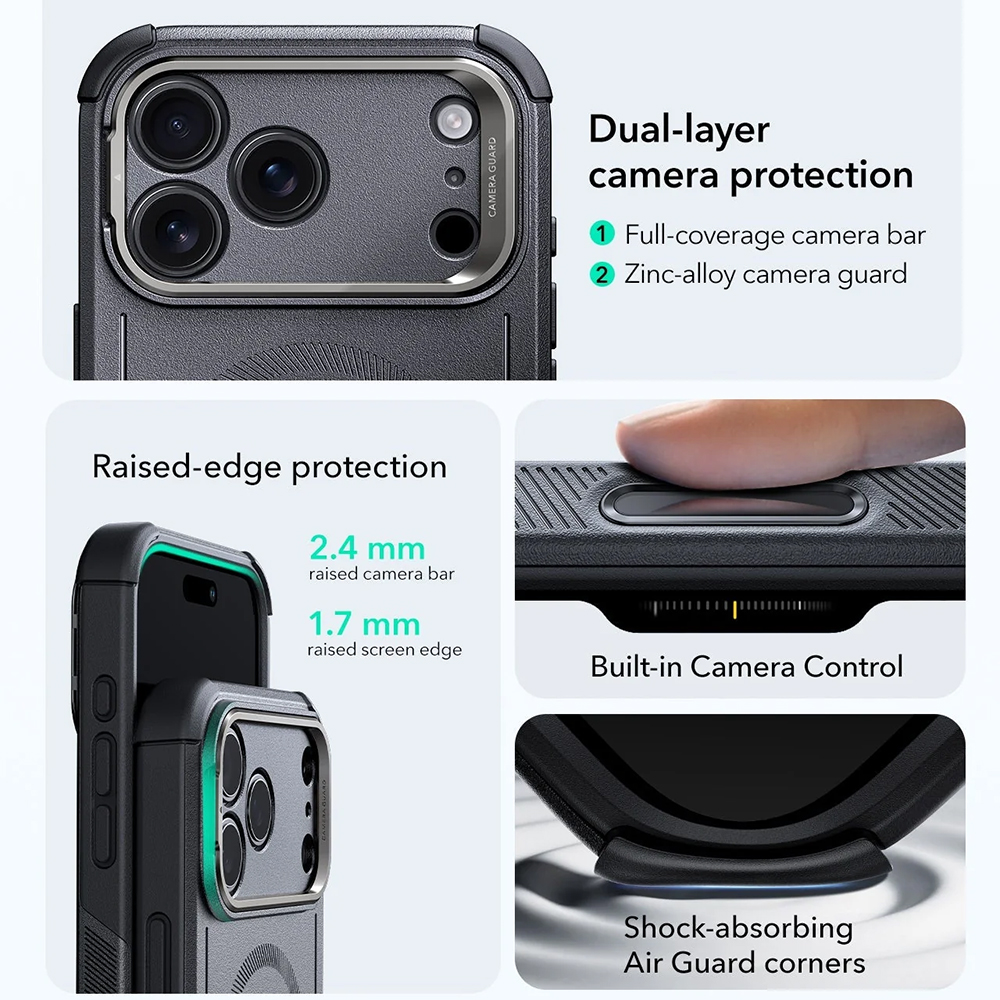 Pouzdro ESR Cyber Armor Kickstand se vyznačuje robustním a moderním designem, který podtrhuje linie vašeho iPhone 17 Pro Max. Jeho šedá barva dodává telefonu sofistikovaný vzhled, zatímco matný, texturovaný povrch zajišťuje pevný úchop a odolnost proti otiskům prstů. Klíčovým prvkem designu je zesílená ochrana rohů a zvýšené okraje kolem displeje a modulu fotoaparátu, které efektivně chrání před nárazy a poškrábáním. Integrovaný kovový stojánek na zadní straně umožňuje pohodlné sledování obsahu v horizontální poloze, což je ideální pro videohovory nebo sledování filmů. Pouzdro je plně kompatibilní s technologií MagSafe, což zajišťuje bezpečné a rychlé bezdrátové nabíjení a snadné připojení MagSafe příslušenství.