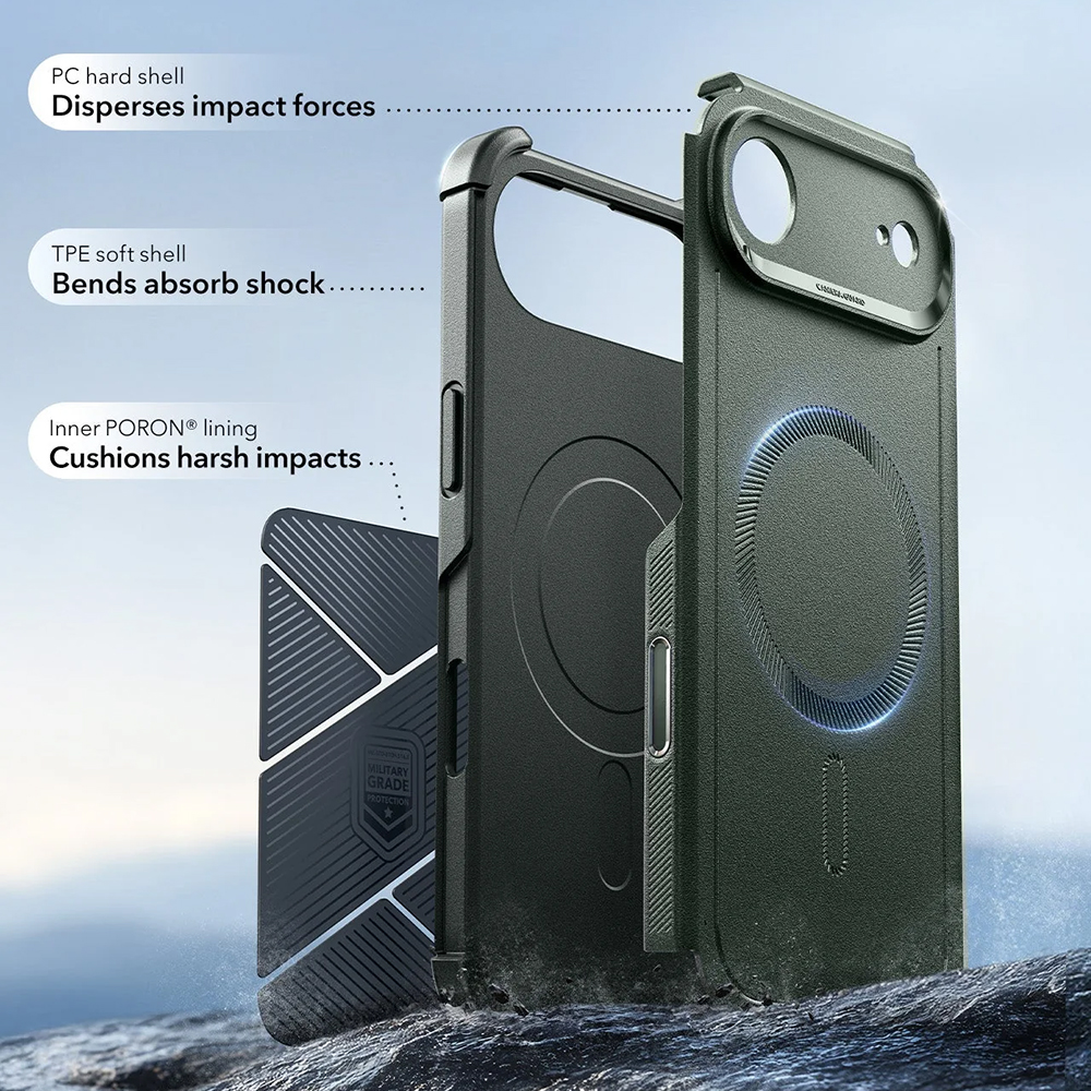 Pouzdro ESR Cyber Halolock se pyšní promyšlenou vícevrstvou konstrukcí, která zajišťuje bezkonkurenční ochranu. Vnější PC hard shell efektivně rozptyluje nárazové síly, zatímco vnitřní TPE soft shell absorbuje otřesy. Pro maximální bezpečí je pouzdro vybaveno také vnitřní PORON® podšívkou, která tlumí silné nárazy. Díky této kombinaci materiálů splňuje pouzdro přísné standardy vojenské ochrany (MIL-STD-810H 516.8) a nabízí až 7x vyšší odolnost proti pádům.