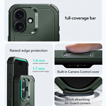 Kryt ESR Cyber Halolock se pyšní robustním, avšak stylovým designem v hlubokém zeleném odstínu, který dodá vašemu iPhone 17 sofistikovaný vzhled. Jeho matný povrch nejen skvěle vypadá, ale také zlepšuje úchop a minimalizuje otisky prstů. Konstrukce pouzdra je vícevrstvá, navržená pro absorpci a rozptýlení nárazů. Skládá se z tvrdé PC skořepiny, která rozptyluje síly nárazu, měkké TPE vrstvy pro tlumení otřesů a vnitřní PORON® podšívky, která tlumí silné dopady.