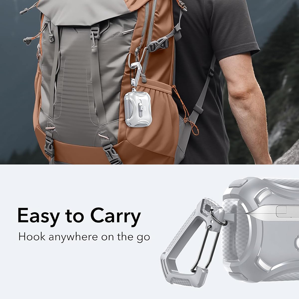 Praktické detaily zahrnují přesné výřezy pro nabíjecí port, reproduktor, který umožňuje jasné slyšení upozornění funkce „Najít“, a viditelnou LED diodu pro indikaci stavu nabíjení. Integrovaná karabina umožňuje snadné připevnění pouzdra k batohu, opasku nebo klíčům, takže vaše AirPods budete mít vždy po ruce.