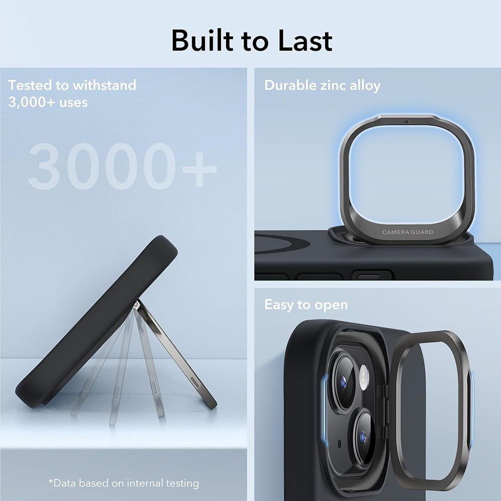 Kryt se pyšní minimalistickým a elegantním černým provedením s matným povrchem, který je nejen vizuálně atraktivní, ale také příjemný na dotek a zajišťuje lepší úchop. Jeho design je promyšlen do posledního detailu, aby dokonale splynul s liniemi vašeho iPhonu. Integrovaný kovový stojánek, vyrobený z odolné zinkové slitiny, je chytře umístěn kolem modulu fotoaparátu a umožňuje stabilní postavení telefonu v horizontální i vertikální poloze. Díky tomu si můžete pohodlně vychutnat sledování obsahu, videohovory nebo procházení aplikací bez nutnosti držet telefon v ruce. Stojánek je navržen pro více než 3000 použití a snadno se otevírá. Pro maximální ochranu displeje a objektivů fotoaparátu je kryt vybaven zvýšenými okraji – 1,8 mm kolem fotoaparátu a 1,2 mm kolem displeje.