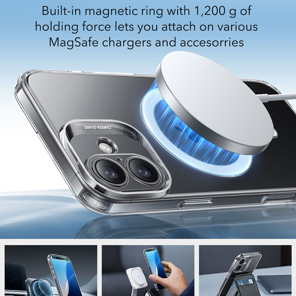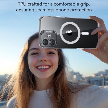 Pro maximální bezpečnost je kryt vybaven zvýšenými okraji – 1,0 mm kolem displeje a 0,7 mm kolem modulu fotoaparátu – které efektivně chrání před poškrábáním a nárazy. Klíčovou vlastností je integrovaný magnetický kroužek HaloLock™, který nabízí působivou přídržnou sílu 1 200 g. To zaručuje bezpečné a spolehlivé uchycení k široké škále MagSafe nabíječek a příslušenství, čímž rozšiřuje možnosti používání vašeho telefonu.