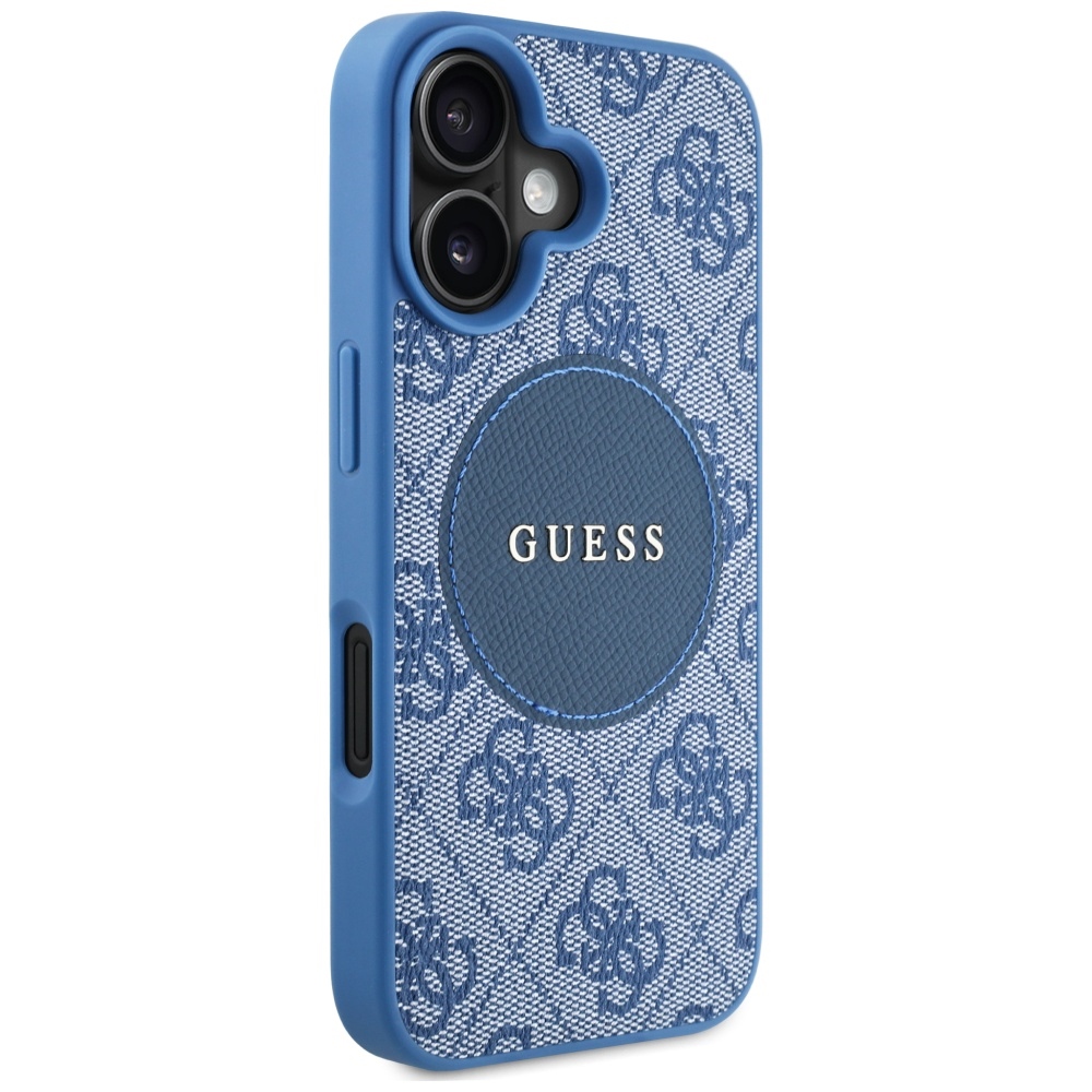 Tento konkrétní model se pyšní sofistikovaným designem v modrém odstínu, který je elegantní a zároveň moderní. Zadní strana pouzdra je zdobena ikonickým 4G monogramem, který je jemně texturovaný a dodává krytu luxusní vzhled. Uprostřed zadní strany dominuje výrazný kruhový prvek ve stejném modrém tónu, na kterém je elegantně umístěno logo GUESS. Okraje pouzdra jsou v jednotné, sytější modré barvě, která dokonale doplňuje celkový vzhled a zajišťuje pohodlné držení. Pouzdro je navrženo tak, aby bylo štíhlé a lehké, a přitom poskytovalo spolehlivou ochranu proti poškrábání a drobným nárazům. Integrovaná technologie MagSafe zajišťuje bezproblémové a rychlé bezdrátové nabíjení a kompatibilitu s MagSafe příslušenstvím.