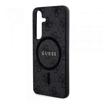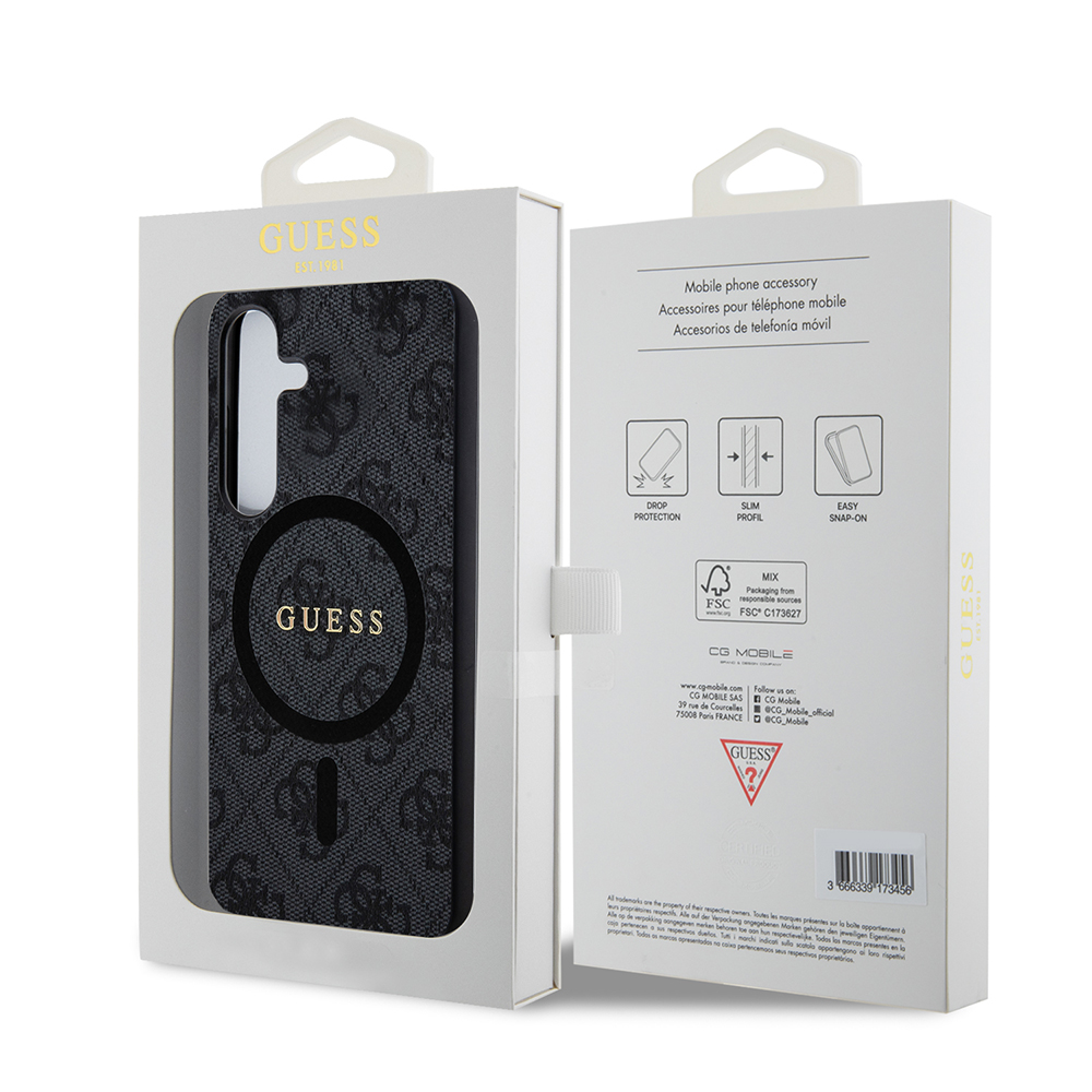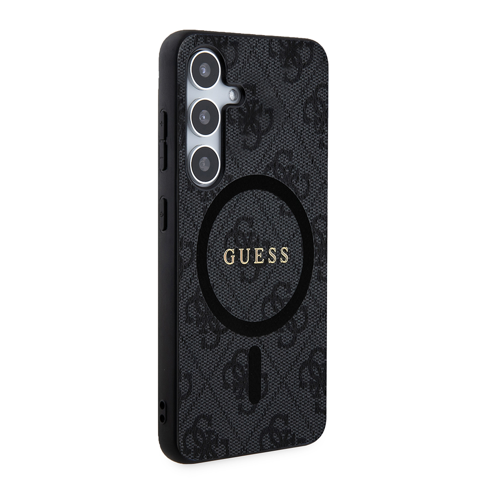 Kryt Guess 4G Collection Leather MagSafe pro Samsung Galaxy Z Flip7 se pyšní sofistikovaným designem. Celý povrch je pokryt charakteristickým 4G monogramem, který je decentně vyražen do textury připomínající kůži, což dodává pouzdru luxusní vzhled a příjemný pocit na dotek. Dominantou zadní strany je výrazné zlaté logo "GUESS", elegantně umístěné uprostřed černého kruhu, který indikuje plnou kompatibilitu s technologií MagSafe. Díky tomu můžete snadno a bezpečně připevnit MagSafe příslušenství a využívat bezdrátové nabíjení.